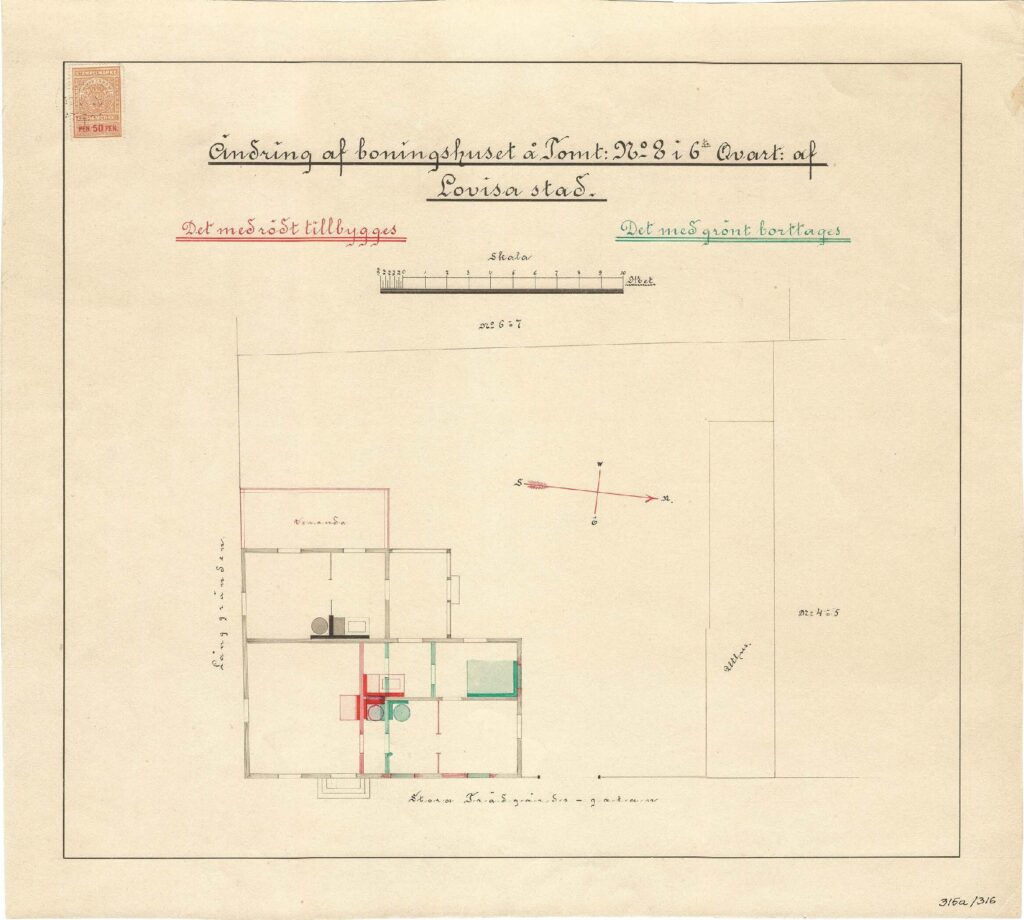 Den andra ändringsritningen lägger till ett fjärde fönster till fasaden mot gatan och en stor glasveranda inför gavel av östra flygeln. Enligt ritningen fanns det också ytterligare ett fönster i gavel av norra flygeln, vilket föreslås tas bort. Huset är uppdelat i två lägenheter som delar en gemensam farstu. På gårdssidan finns ett rum och ett kök samt den tidigare nämnda glasverandan. På gatusidan finns tre rum och ett kök samt en anslutning till den tidigare salen, som hade byggts om till kommersiell lokal. Senare ersattes glasverandan på gårdssidan av en liknande, hälften mindre byggnad, vars spår fortfarande kan ses på gårdsfasaden. Fönstren förnyades troligen någon gång på 1920- eller 1930-talen, men T-stommen och rutnätsindelningen från slutet av 1800-talet har bevarats.